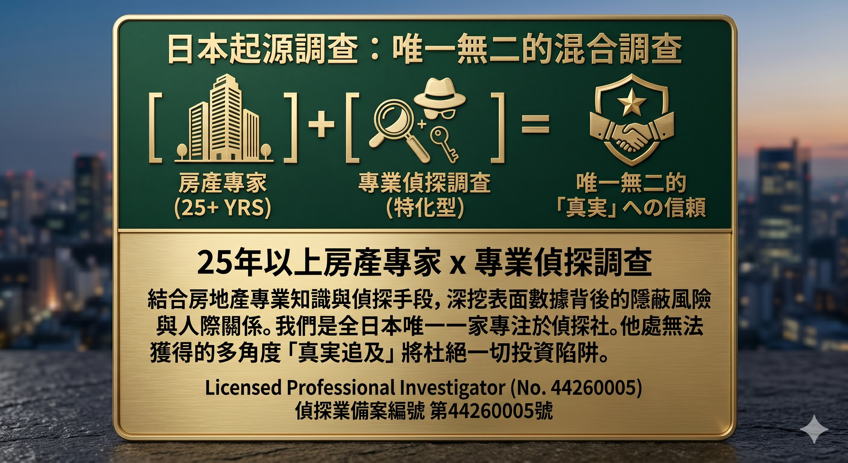 我司致力於挖掘並提供作為投資決策依據的「隱藏真相」。房地產交易專家與實地調查專家(偵探)強強聯手,無需投資者親臨現場,即可提供旨在掌握房產「真實面貌」的盡職調查。透過AI數據分析與實地走訪調查,我們將為您徹底排查潛在風險。