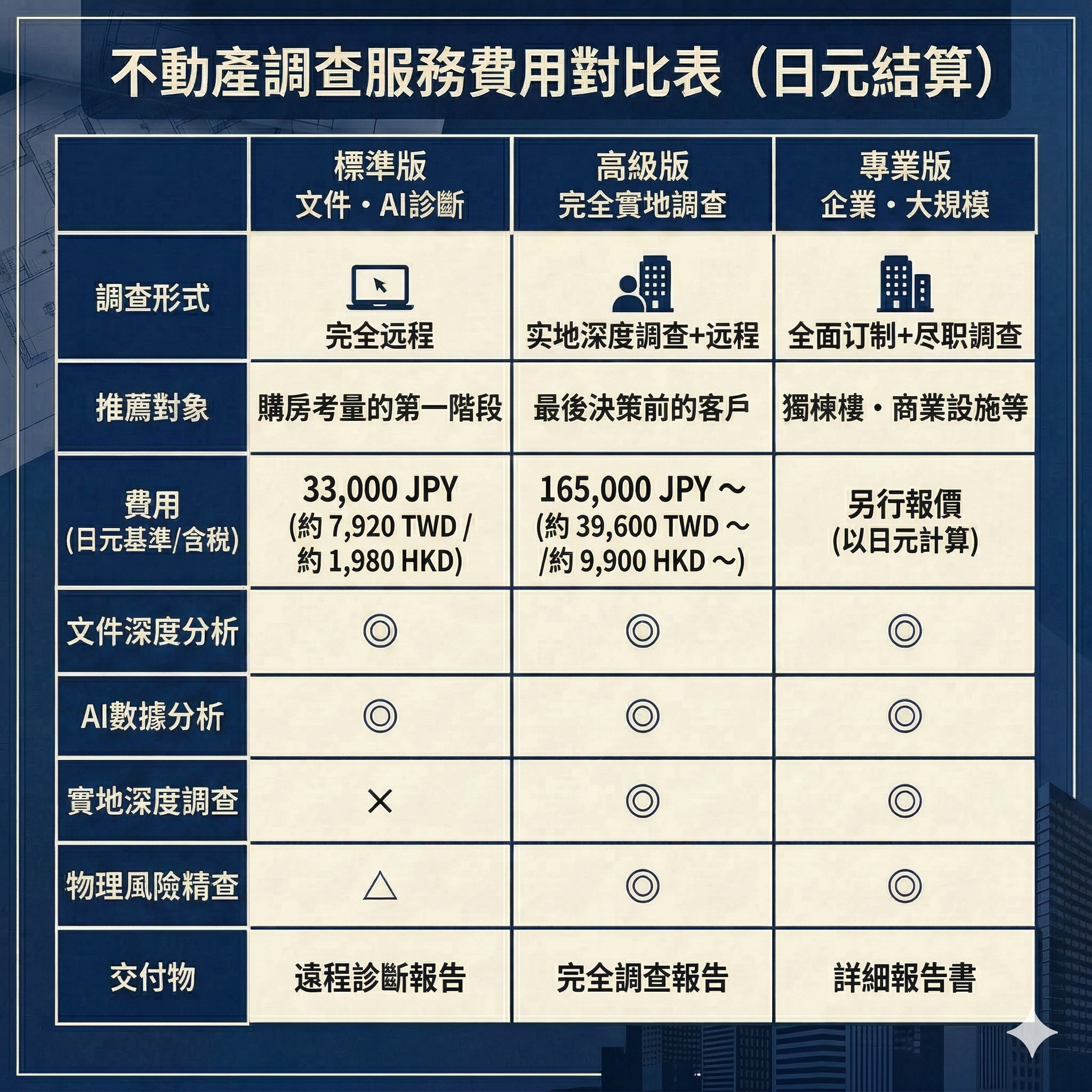 [注意事項] 原則上需以日圓(JPY)進行簽約。所列台幣(TWD)及港幣(HKD)金額僅供參考,實際費用將根據結算時的匯率而有所變動。如涉及大規模項目或需同時調查多處房産,我們將透過「專業版」為您提供單獨報價。