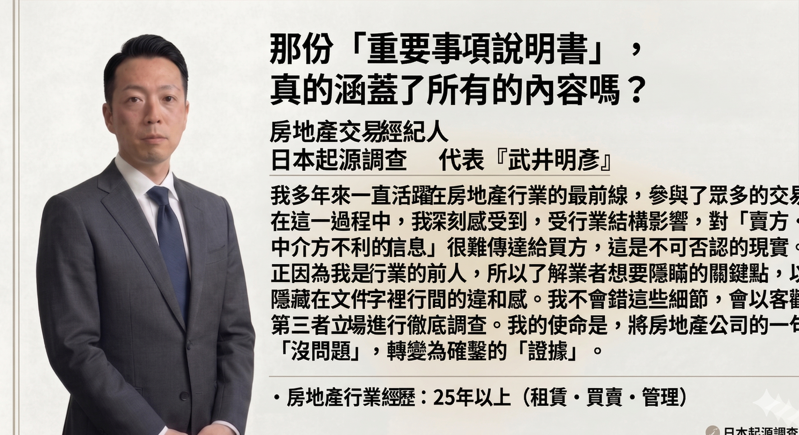 重要事項說明主要側重於文件上的說明。我司作為「第三方機構」,旨在挖掘房仲未掌握(或不具備告知義務)的建築物物理瑕疵等,並使其浮上檯面。